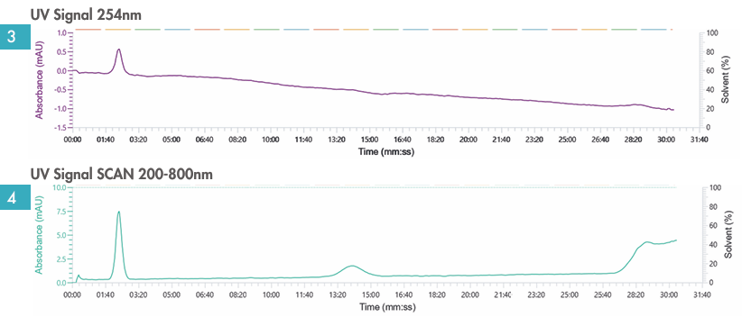 圖3與圖4:紫外檢測下化合物不可見。檢測初期首波化合物開始顯現(xiàn)低強(qiáng)度信號,但強(qiáng)度不足以實(shí)現(xiàn)有效收集