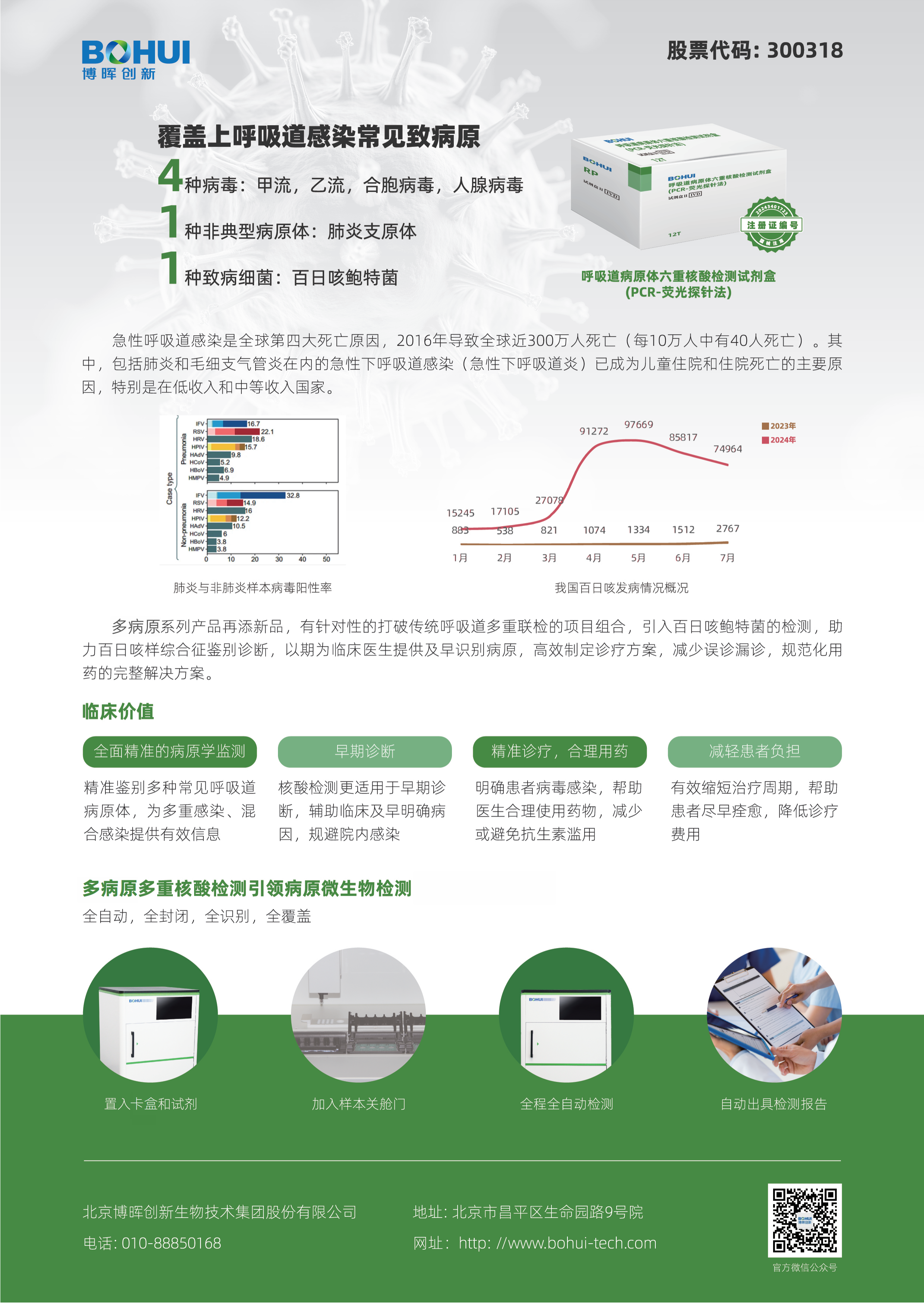 面對(duì)潛在的跨境傳播風(fēng)險(xiǎn),早期精準(zhǔn)檢測(cè)是防控的關(guān)鍵環(huán)節(jié)。博暉創(chuàng)新深耕分子診斷領(lǐng)域,推出的呼吸道病原體六重核酸檢測(cè)試劑盒(國(guó)械注準(zhǔn) 20243401723)可檢測(cè)甲型流感病毒、乙型流感病毒、呼吸道合胞病 毒、腺病毒、肺炎支原體、百日咳鮑特菌,這也是目前包含百日咳多聯(lián)檢獨(dú)家解決方案,為百日咳及常見(jiàn)呼吸道病原體檢測(cè)提供了高效工具。該系列試劑盒采用全封閉泵液模塊結(jié)合熒光定量 PCR 技術(shù),可實(shí)現(xiàn)全自動(dòng)一體化檢測(cè),操作簡(jiǎn)便且結(jié)果精準(zhǔn),能快速區(qū)分百日咳鮑特菌與其他呼吸道病原體,助力臨床早期診斷、及時(shí)干預(yù)。